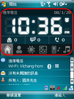 - 首先大力推薦的是HTC Home,可以讓Today的畫面更美觀!就是下圖中紅框的部份,時鐘加大而且會顯示新的Email簡訊和未接來電。參考資料:小熊工作室 Studio KUMA | Windows Mobile 相關小程式